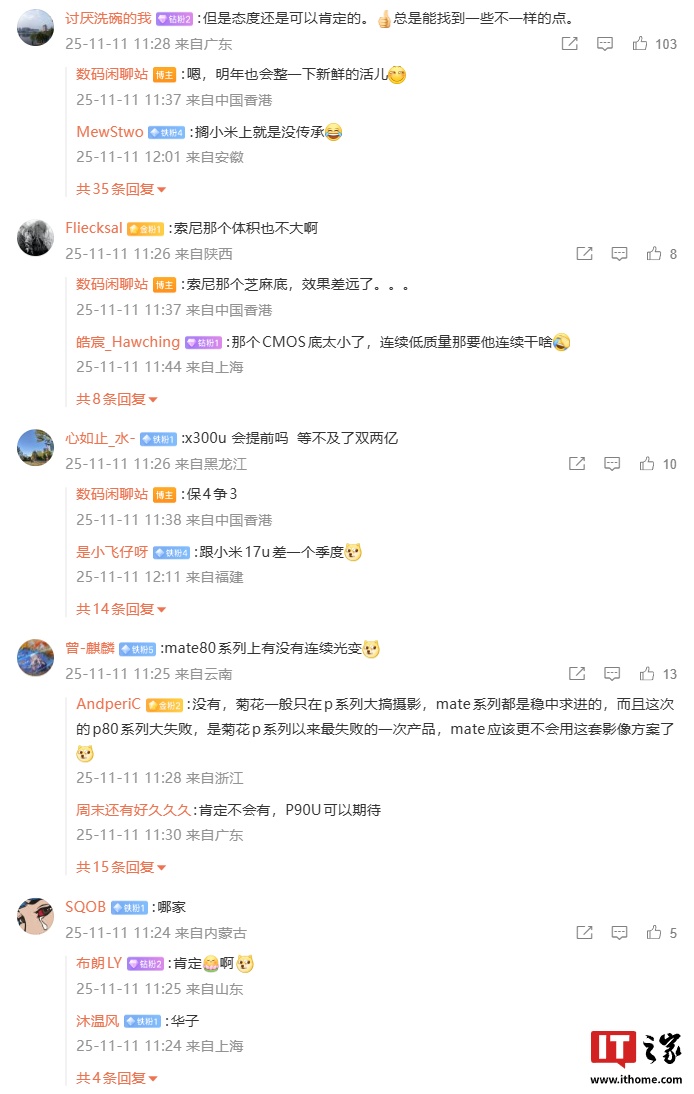 值得一提的是,博主还在评论区透露,华为明年也会整一下新鲜的活儿。此外,关于 vivo X300 Ultra 手机的发布时间是否会提前,博主表示:“保 4 争 3。”