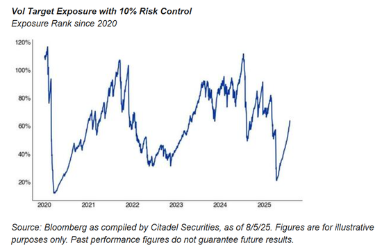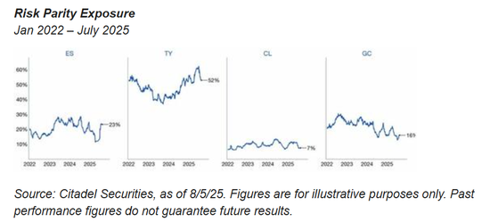 波动率控制策略:可能会随着波动率的下降而继续增加股票敞口。鉴于上周五波动率的上升,波动率控制策略的买入需求可能会开始停滞。对于风险控制为10%的波动率目标策略,当前股票敞口为65%,大幅高于4月份的20%低点,不过仍低于2024年12月的91%峰值。总体上,风险敞口在收窄。 风险平价策略:也具有增加股权敞口的能力,但Citadel Securities的配置比例正开始回归历史水平,目前水平为23%。