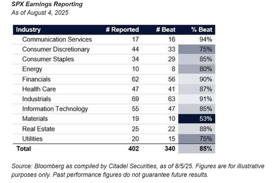 尽管当前财报季表现强劲——据彭博数据,已公布业绩的公司中有85%超预期,远高于74%的十年均值——且企业股票回购有望在8月增加,但这些利好因素可能难以抵挡资金面和季节性规律带来的双重压力。Rubner的结论是,随着两大买盘力量的消退和历史性弱势月份的到来,市场正变得越来越容易受到下行冲击的影响。