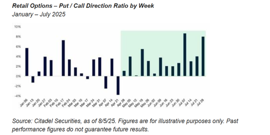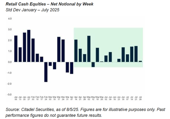 然而,这种强劲势头潜藏着季节性风险。Rubner指出,历史数据显示,散户的交易活跃度在6月和7月达到高峰后,通常会在8月开始减速,并在9月“返校季”跌至全年最低水平。这意味着市场即将失去一个最坚定的“抄底”力量。